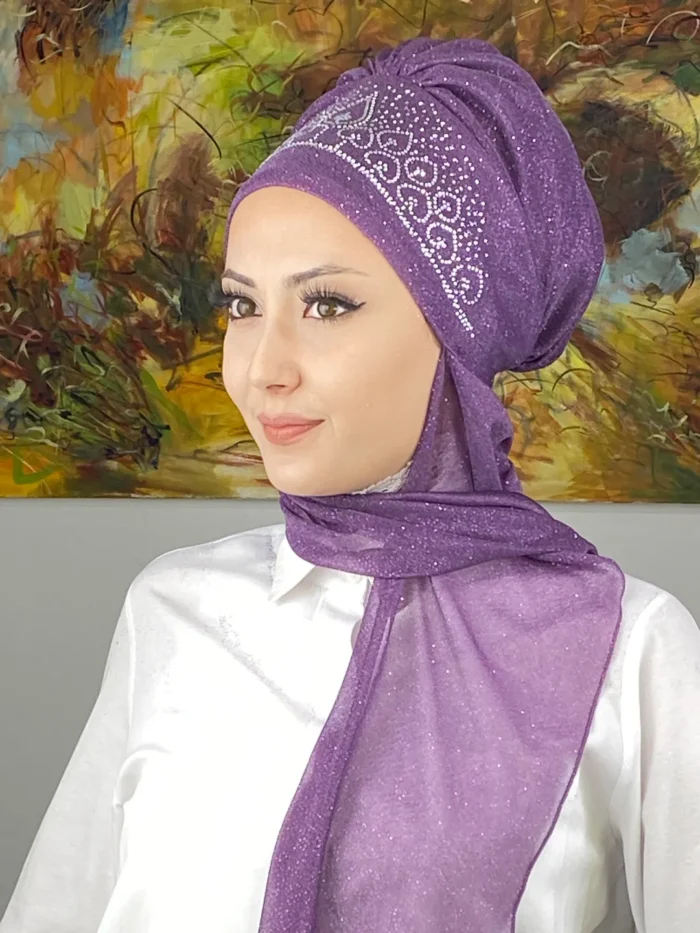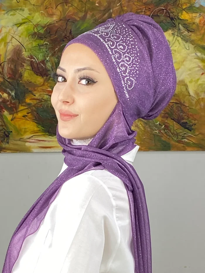Leylak Güneş Model Taşlı Bone Şal, sade renk tonunu taşlı detaylarla harmanlayarak hem zarif hem dikkat çekici bir etki yaratır.