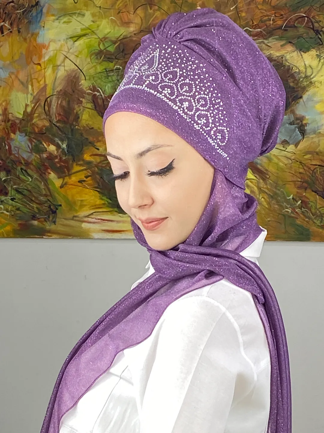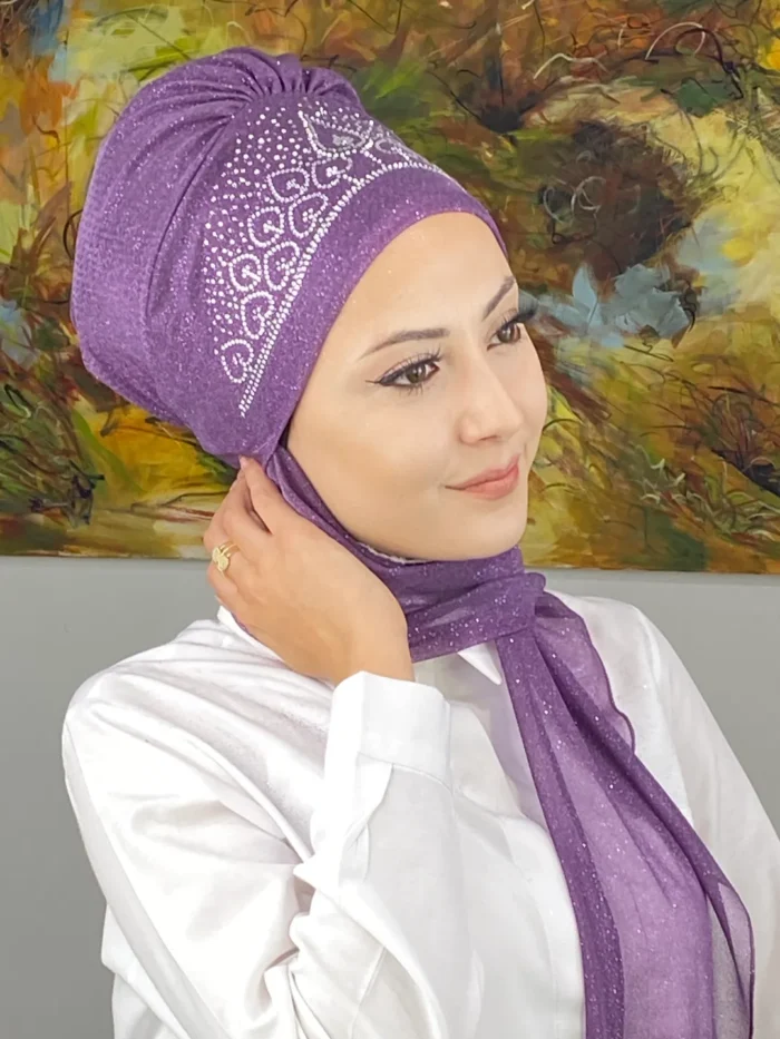 Vintage Model Taşlı Abiye Atkılı Bone Şal – Leylak