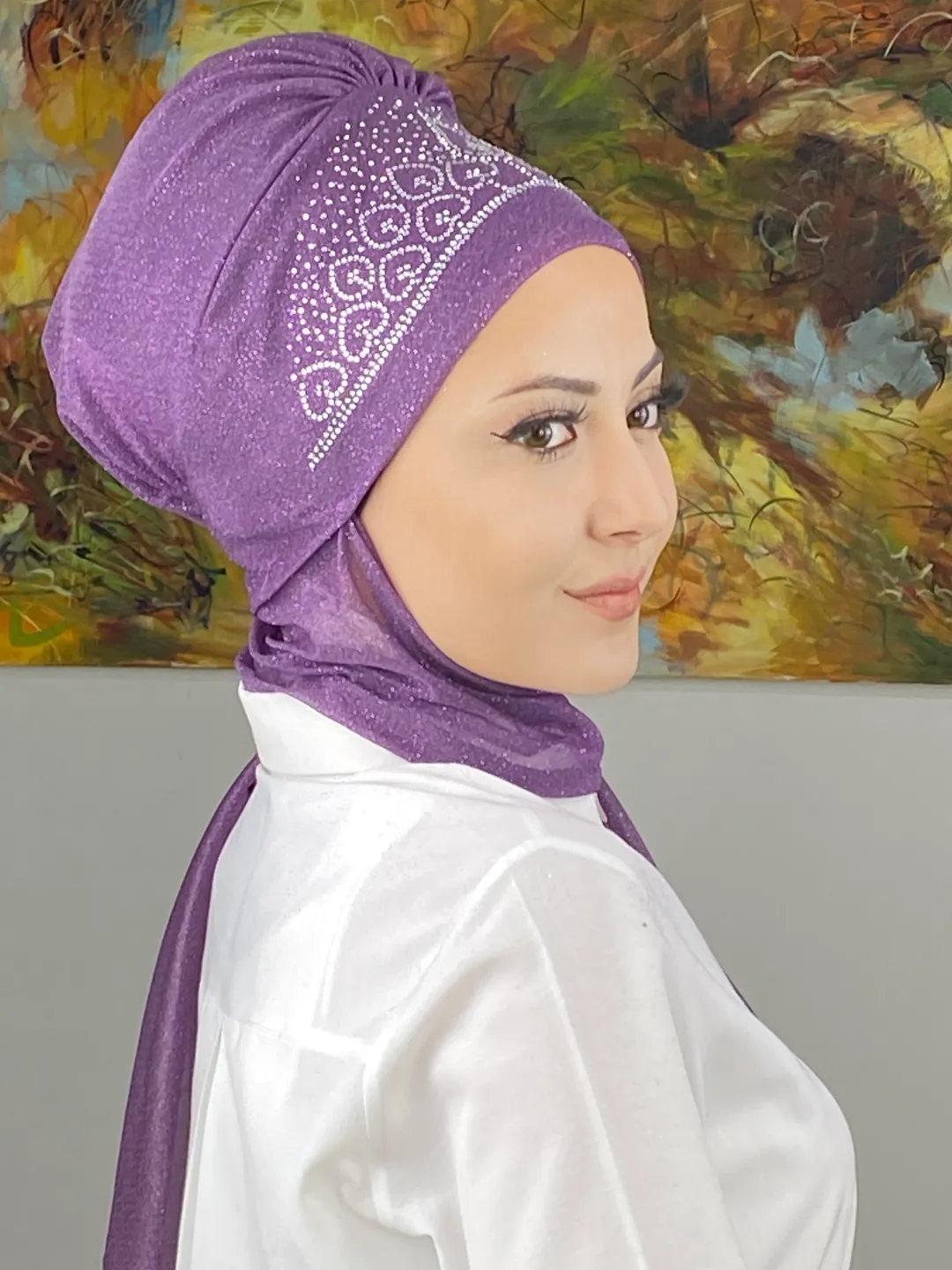 Vintage Model Taşlı Abiye Atkılı Bone Şal – Leylak | Zarif Pastel Işıltı 💜